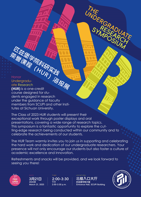 下周五,2025年3月21日下午2:00,2023级HUR课程的同学,将通过海报展示和陈述报告的形式,分享他们在HUR课程里的成果。