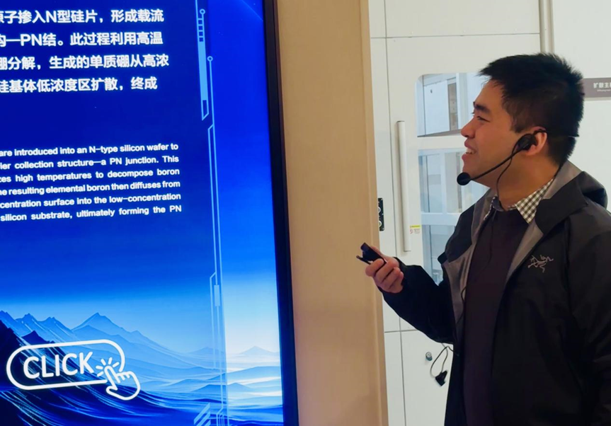 科技馆沉浸式展厅内,180°弧形巨幕同步点亮,呈现全球最大单体光伏电站实景;伴随“盘古开天”主题光影秀,日光转化为能量洪流注入城市脉络,震撼视效引发全场赞叹。“光赋零碳”互动展区通过“一度电的意义”“车轮上的能源革命”“光伏与AI的未来图景”三大装置,系统展示“光伏+”的多元应用场景,深刻阐释清洁能源赋能人类可持续发展的价值。