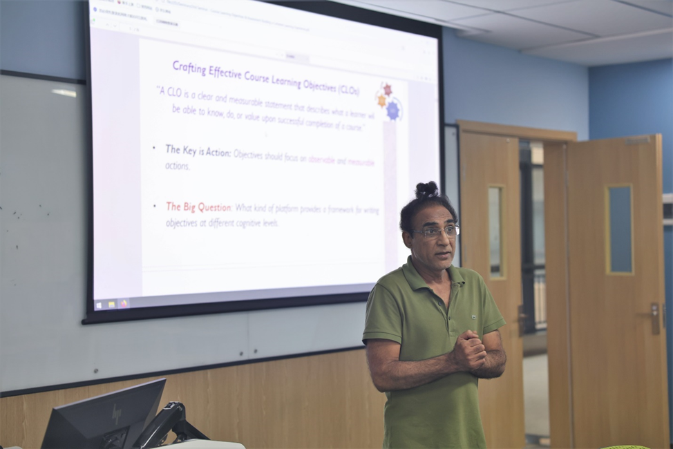 Mushe Loan副教授首先强调了课程学习目标与其评估内容的重要性,同时指出传统教学中存在学习目标模糊、教学活动与评估脱节的问题。针对此现象,他介绍了一套有效、可衡量的课程学习目标(CLO)与评估体系,该体系在教学中的运用能够使学习目标、课程教学、成果评估三个要素相统一,让学生获得连贯且目标明确的学习体验,由此提升学习积极性。