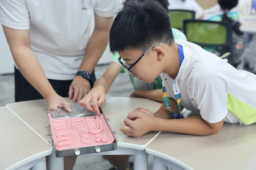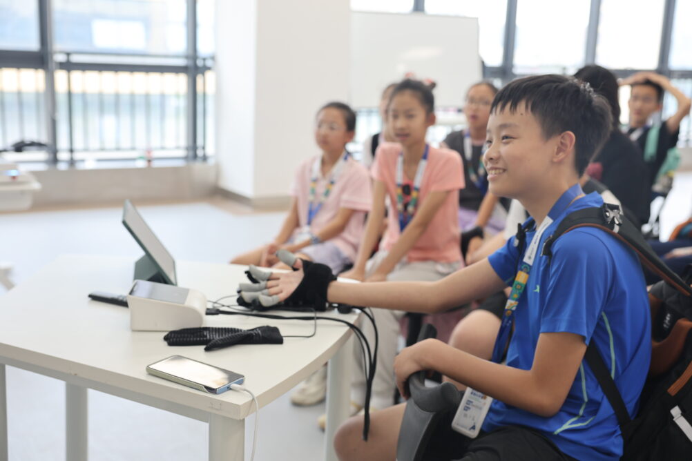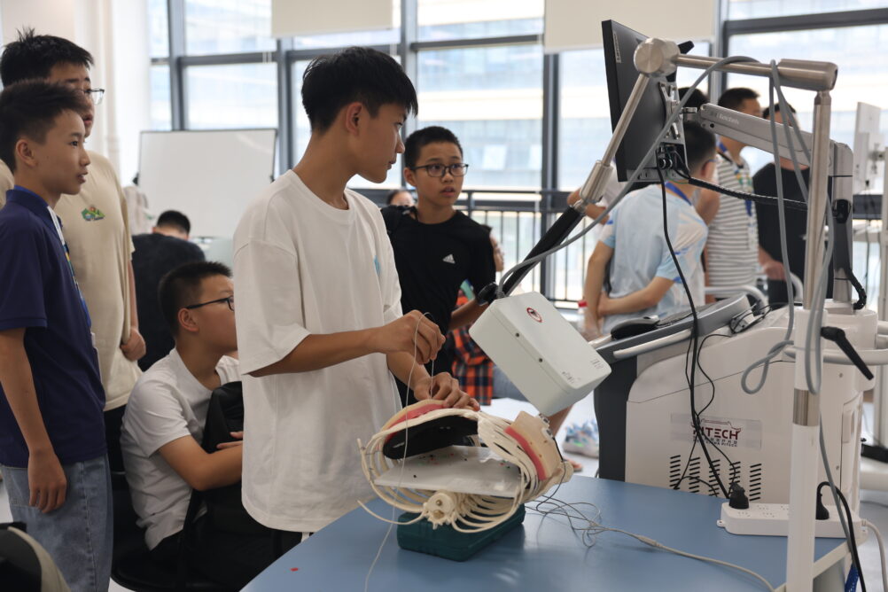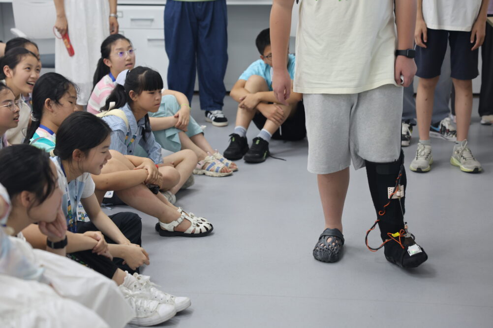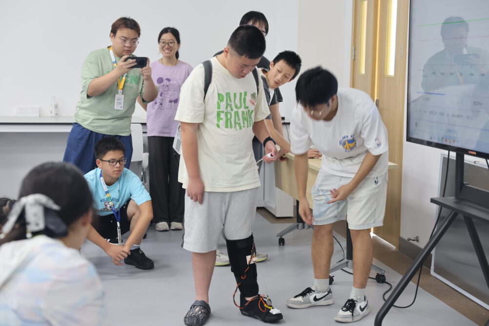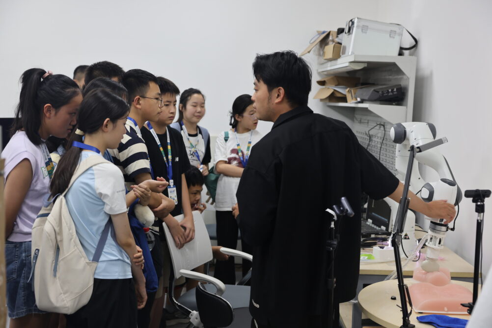 在医学人工智能实验室,同学们变身“手术医生”,感受穿刺手术机器人如何在手术室帮助医生实现精准定位导航;在“深海挑战”“传送带抓握” 等互动游戏中,感受具身智能机器人如何以恰到好处的力度辅助肢体运动带来的康复效果。