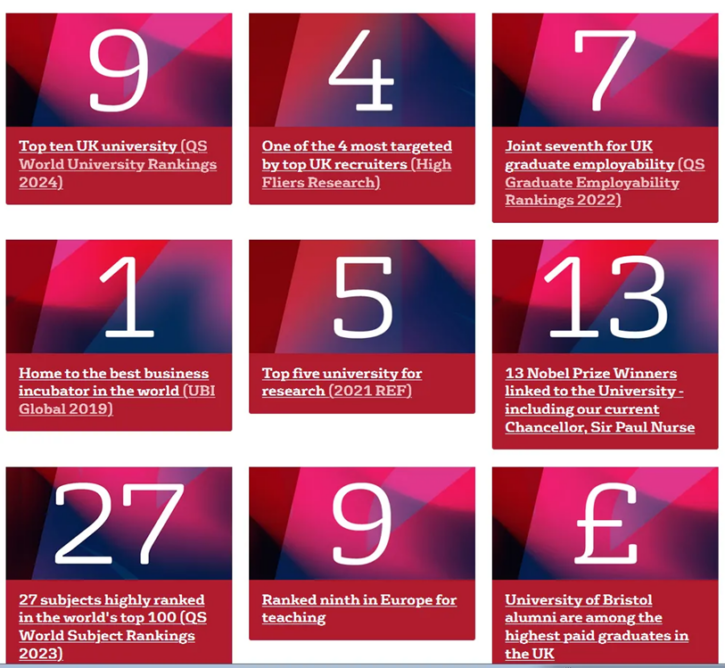 布里斯托大学(University of Bristol),简称“布大”,始建于1876年,位于英格兰西南部被誉为“欧洲硅谷”的布里斯托市,世界排名第54位(QS2025)、是世界一流研究型大学及英国著名的六所红砖大学之一。布里斯托大学拥有众多学术界教授和校友,其中包括47位皇家学会研究员、17位英国科学院研究员、13位诺贝尔奖获得者。布里斯托大学被评为全英科研质量最好的五所顶尖研究型大学之一,其工程学院素有“工程王国”之称。