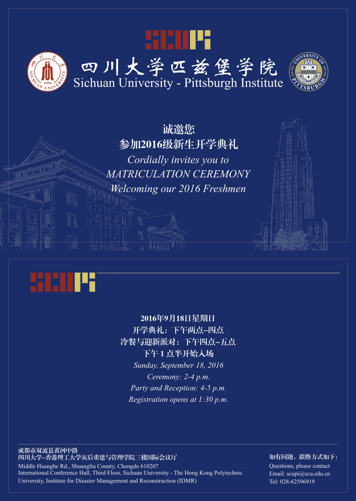 On Sunday, September 18, 2016, 2pm, matriculation ceremony for class of 2016 will be held at International Conference Hall, third floor, Sichuan University – The Hong Kong Polytechnic University, Institute for Disaster Management and Reconstruction (IDMR). The chancellor of University of Pittsburgh, the president of Sichuan University, and officers from both universities will be attending the ceremony. Reception will be held from 4:00 – 5:00pm for all faculties, staff, students, and their parents. We would like to invite all parents to join us at the matriculation ceremony. For appointment, Please click here or send student’s name, number of attendants, and contact information to by September 1st.