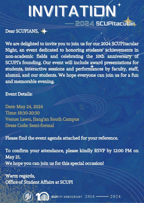 This event is dedicated to honoring our students’ achievements in non-academic fields and celebrating the 10th anniversary of SCUPI’s founding. The evening will feature award presentations for students, interactive sessions, and performances by faculty, staff, alumni, and students.