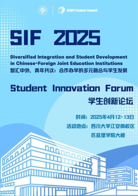 The Student Innovation Forum (SIF) at Sichuan University – Pittsburgh Institute (SCUPI) will take place on April 12th and 13th, 2025, at the Jiang’an South Campus, Sichuan University. This forum aims to provide a platform for students from Sino-foreign cooperative educational institutions to engage in dialogue, enhance their communication skills, enrich campus life, and explore future career development prospects.