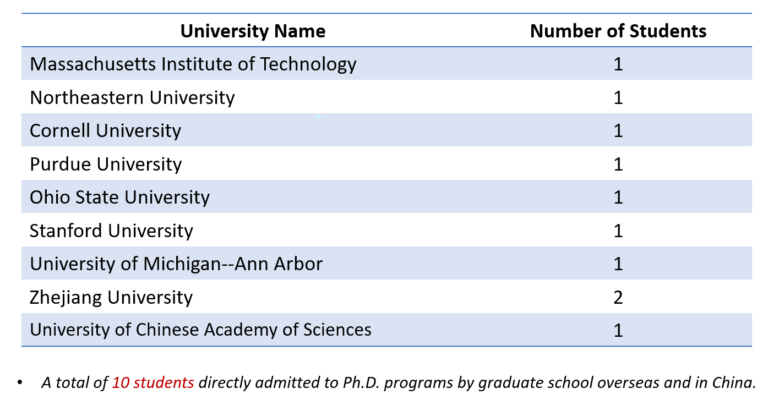 - Of the 170 graduates, 149 or 87.65% continued to pursue graduate study, 110 or 74 % chose to study overseas, while 39 chose to stay in China for further education.