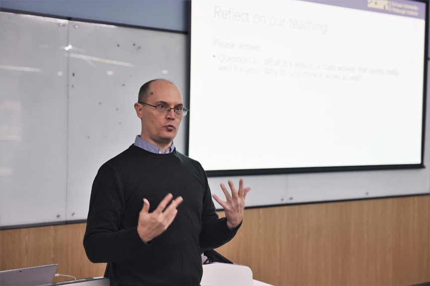 院长邱民京教授、教学副院长麦诚志教授、学工副院长李烨与二十余名教职工共同参与了本次研讨会。主讲人为助理教授Mathew Evans,他以“设计式学习”为主题开展教学分享,和与会人员一同探讨了如何找到实用教学方法,优化课堂效果。