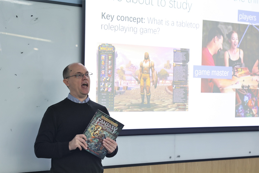 “设计式学习”同样关注四大知识过程——体验、概念化、分析、应用。Mathew老师结合自己所教授的学术写作课程,详细阐释了这一教育框架的实践路径。在课堂上,他组织学生开展桌面角色扮演游戏,将四个知识过程融入到游戏进程与任务中,引导学生进行沉浸式体验、批判性分析、学习撰写优质选题并反思回顾。而教师在其中需要观察并记录学生的优秀表现与认知误区,为后续新主题导入及复习环节做好铺垫。